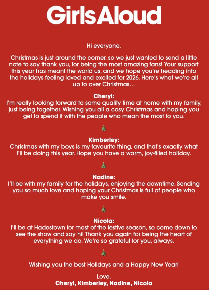 Girls Aloud message Hi everyone! Christmas is just around the corner, so we just wanted to send a little note to say thank you, for being the most amazing fans! Your support this year has meant the world to us, and we hope you're heading into the holidays feeling loved and excited for 2026. Here's what we're all up to over Christmas... Cheryl: I'm really looking forward to some quality time at home with my family, just being together. Wishing you all a cosy Christmas and hoping you get to spend it with the people who mean the most to you. Kimberley: Christmas with my boys is my favourite thing, and that's exactly what I'll be doing this year. Hope you have a warm, joy-filled holiday.Nadine: I'll be with my family for the holidays, enjoying the downtime. Sending you so much love and hoping your Christmas is full of people who make you smile. Nicola: I'll be at Hadestown for most of the festive season, so come down to see the show and say hi! Thank you again for being the heart of everything we do. We're so grateful for you, always. Wishing you the best Holidays and a Happy New Year! Love, Cheryl, Kimberley, Nadine, Nicola via Girls Aloud newsletter