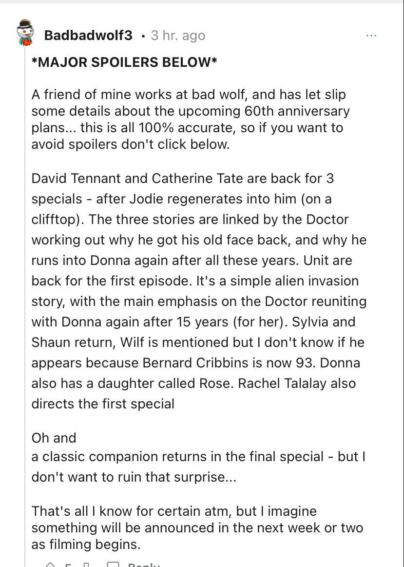May 16, 20223 yr Author The original press release doesn’t actually refer to Ncuti as 14 actually. I’m not too fussed with that idea, but I still think it’s likely. But I suppose we’ll find out in October. RTD’s quite grand plot description also suggests that it’ll be more than just a few “scenes” “They’re back! And it looks impossible – first, we announce a new Doctor, and then an old Doctor, along with the wonderful Donna. What on earth is happening? “Maybe this is a missing story. Or a parallel world. Or a dream, or a trick, or a flashback. The only thing I can confirm is that it’s going to be spectacular, as two of our greatest stars reunite for the battle of a lifetime.” In other news, major character returning spoiler: Bernard Cribbins has been seen on the set in Camden