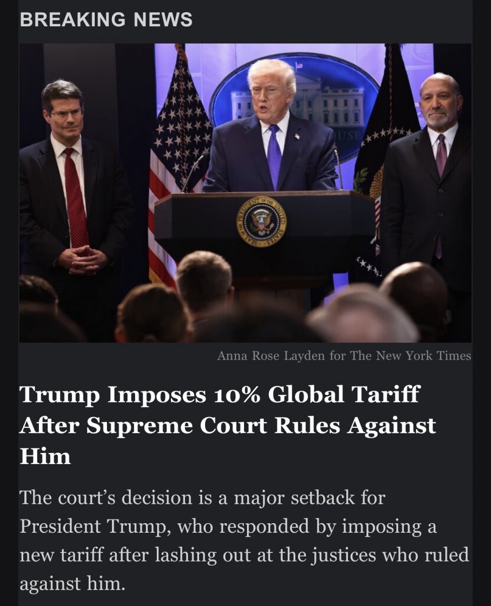 February 23Feb 23 Author Oh, you didn't like unconstitutionally approved tariffs that got struck down by the Supreme Court? How about 10% on the whole world. No, wait, better make it 15% for good measure.