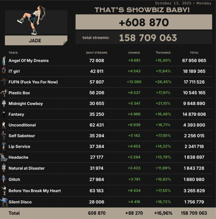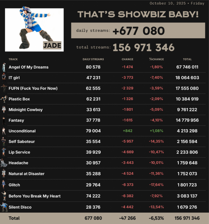 July 17Jul 17 Author Monthly listeners: 2,742,222Plastic Box [4,430,882]Angel Of My Dreams [61,030,381]FUFN (F**k You For Now)* [12,956,231]BOY CRAZY [951,371]IT girl [14,534,842]HOT [7,143,494]Fantasy [12,057,294]Frozen [1,431,277]Midnight Cowboy [7,468,237]Angel Of My Dreams - S.A.D. Version [3,898,132]BOY CRAZY now her 4th most popular song on Spotify!Fantasy overtakes Frozen after a month behind!Angel SAD version is now 100k away from 4 million! It will probably drop out the top 10 before it gets there due to Gossip coming.
