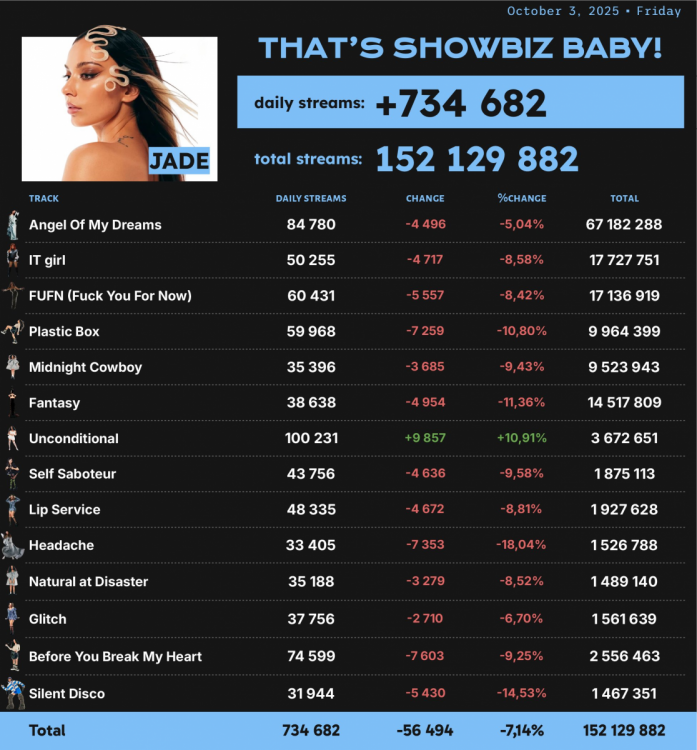 July 7Jul 7 Author Monthly listeners: 2,480,958 (+522,414)Plastic Box [3,345,586]Angel Of My Dreams [60,276,817]FUFN (F**k You For Now)* [12,505,156]IT girl [14,241,703]HOT [6,798,668]Frozen [1,262,983]Fantasy [11,839,775]Midnight Cowboy [7,324,005]Angel Of My Dreams - S.A.D. Version [3,842,402]FUFN (FOR THE CLUB) [559,076]Plastic Box still her top song on Spotify!Angel... over 60 million, FUFN over 12 million and IT girl over 14 million!IT girl finally re-overtaking HOT and now in 4th! Hopefully Frozen can push HOT out the top 5 soon.