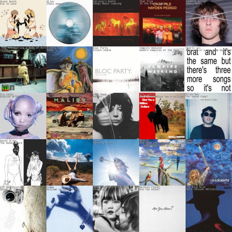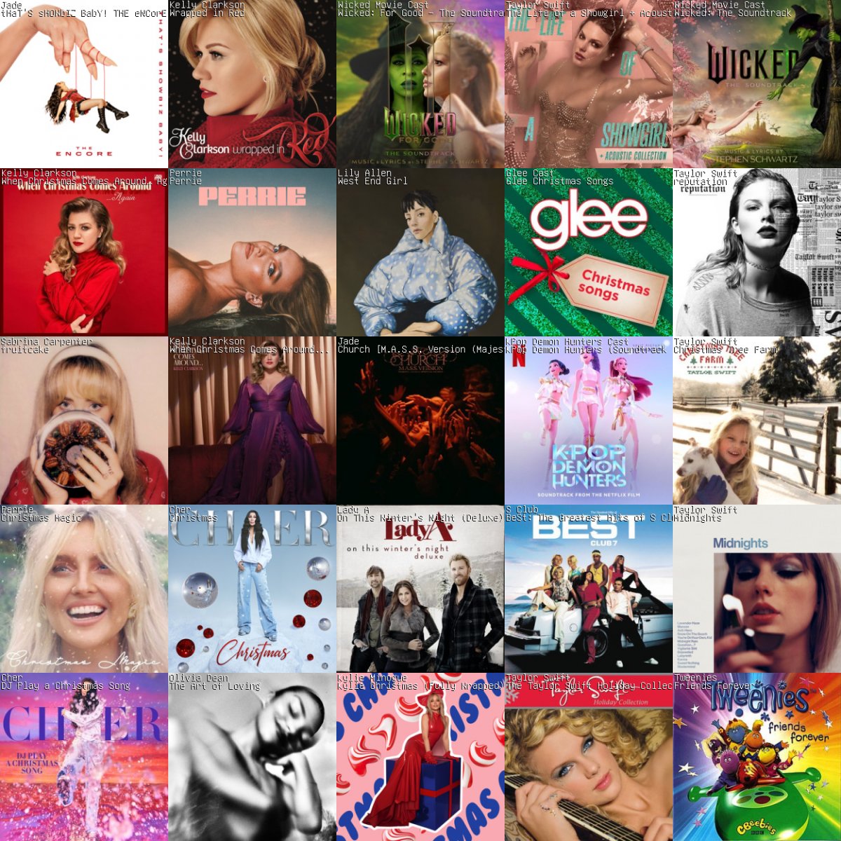 Posted September 1, 2025Sep 1 https://lastcollage.io/collageorhttps://nsfcd.com/lastfm/Show off what you've been listening to lately!I chose a 5x5 collage, and the last month of listening:https://www.last.fm/user/JaydyGaga