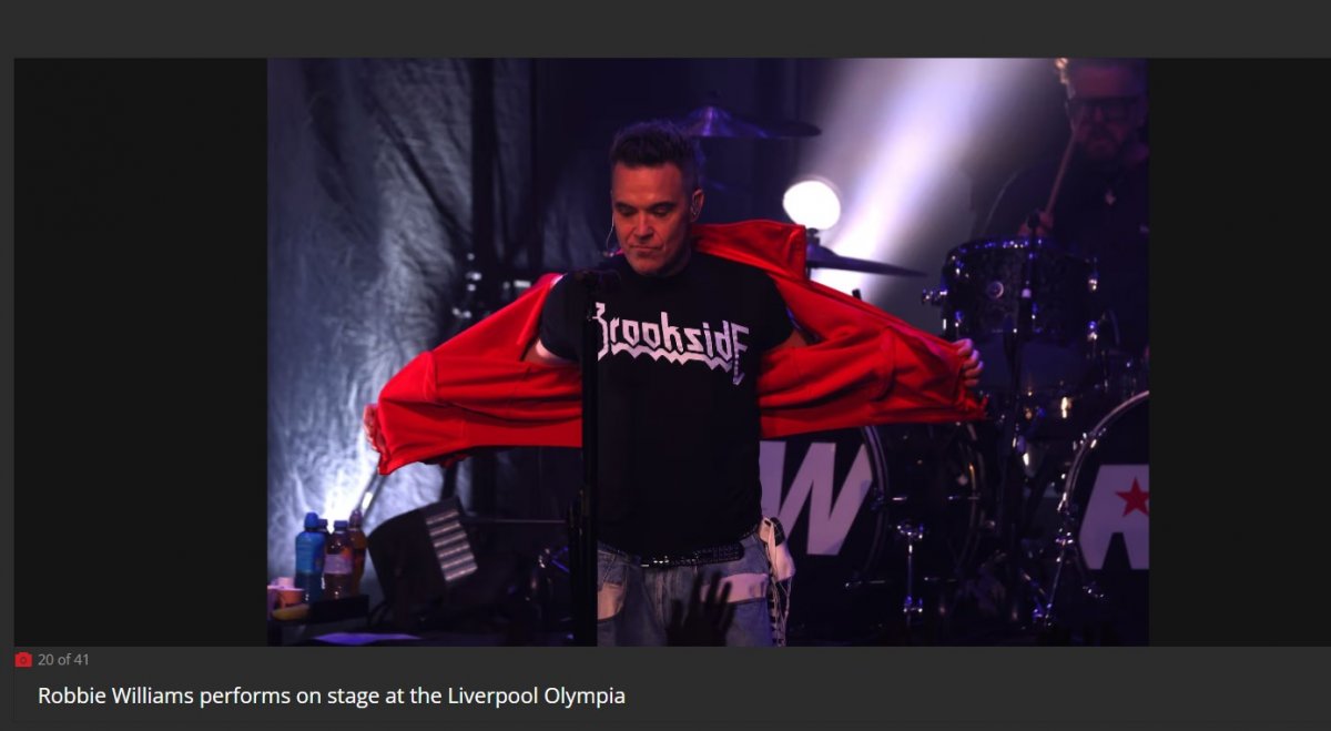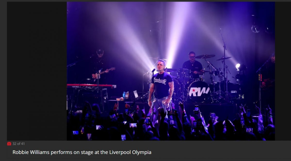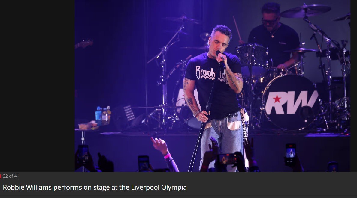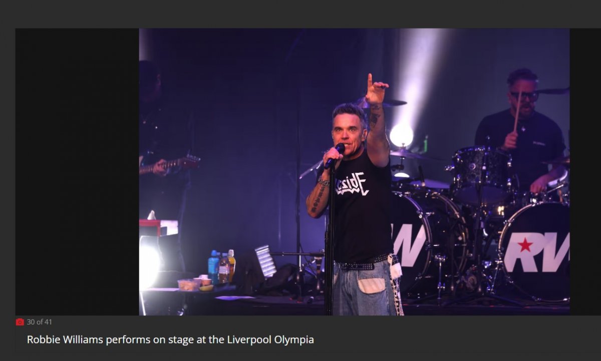 February 7Feb 7 Author 41 photos as Robbie Williams dazzles sold-out Liverpool Olympia crowdRobbie performed his latest album, "Britpop, and his debut solo album, Life Thru a Lens, from start to finishSophie McCoidPatrick EdrichCrime reporter Click on link below for more photos ( link on their website extremely slow to load )41 photos as Robbie Williams dazzles sold-out Liverpool Olympia crowd - Liverpool EchoRobbie Williams dazzled at the Liverpool Olympia tonight as he performed his Long 90s tour to a sell-out crowd. The former Take That man performed in front of a crowd of less than 2,000 starry-eyed fans at the Tuebrook venue in a departure from his usual stadium and arena tours.Robbie performed his latest album, Britpop, in full. The album, which was released in January, recently made Robbie a record-breaker, overtaking The Beatles with the most official UK number one albums ever, according to the Official Charts Company.Robbie will also perform his debut solo album, Life Thru a Lens, from start to finish. His debut album featured huge hits such as Angels and Let Me Entertain You, which shot the singer to global stardom.During the show Robbie paid tribute to the city by wearing a Brookside t-shirt. He then changed into a Surprise, Surprise t-shirt, the TV programme once hosted by Cilla Black. He also referenced the Fab Four and dedicated a song to Atomic Kitten, the four-piece girl group formed in Liverpool.Robbie went viral this week for sharing a video of Greasby teacher Jemma Williamson. The 48-year-old featured on the new Take That documentary which dropped on Netflix last week. In archive footage, Jemma is seen with a group of friends outside HMV in Chester in the early 1990s. The then 14-year-old uses the camera crews to attempt to share her phone number with Robbie Williams.Robbie posted a clip of the moment on his own social media channels, and attempted to give the number a call, which has since been viewed more than three million times.The ECHO made a photographer in attendance during tonight's show to capture the moment the history maker took to the stage. You can read a full review of the show on the ECHO's website later this morning.Visit the ECHO's What's On section to find out more. Edited February 7Feb 7 by Sydney11