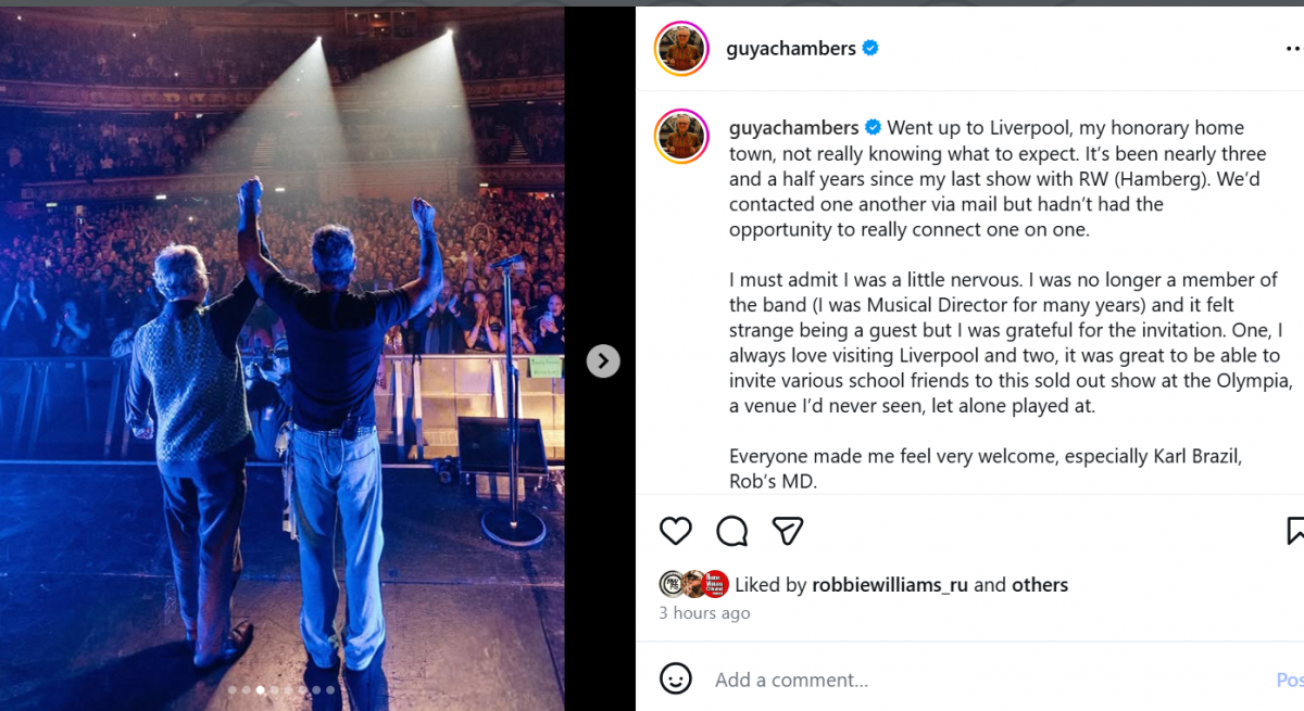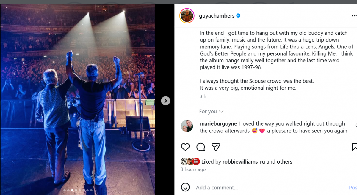 It was brilliant. There was a massive amount of energy in the room. The venue was lovely -never been there before. Packed full but with a sloping floor, we had a great view. Possibly the best view I have ever had of any Robbie gig I've been to. For that we queued for the relatively short time of two hours.