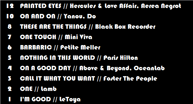 Monday at 20:211 day Author No votes for Paris from vibe and now she has a competition from Foster The People, who they are right behind her after getting 12 from vibe.1Paris Hilton - Nothing In This World362Foster The People - Call It What You Want323Mini Viva - One Touch184Yanou presents Do - On And On185Petite Meller - Barbaric186Feist - My Moon My Man157Sam Sparro - 21st Century Life138VV Brown featuring Kele - Faith109FKA Twigs - Glass & Patron- Josh!1010Sanna Nielsen - I’m In Love- Lee_J11911Little Trees - Turn Around812Friendly Fires - Jump In The Pool813Letoya Luckett - I’m Good- vibe714American Authors - Go Big Or Go Home615Sara Bareilles - Satellite Call616The Bravery - Believe617Black Box Recorder - These Are The Things618It Bites - Wallflower419Imogen Heap - Glittering Cloud (Locusts)120OceanLab - On A Good Day121Zhu - Good Life022Hercules & Love Affair - Painted Eyes023Awolnation - Run024Lamb - One025Fionna Apple - Hot Knife026Cherry Ghost - Mathematics027Malcolm Middleton - Red Travellin’ Socks0