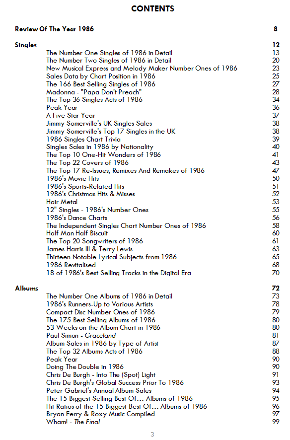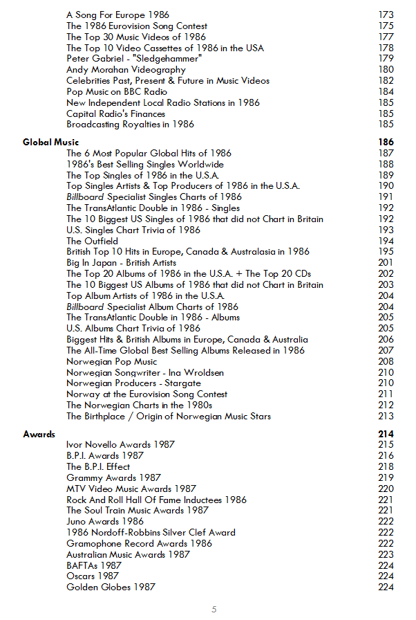 December 5Dec 5 Author The Music Chronicle 1986The latest book in the highly acclaimed series looks in detail at 1986, documenting the best sellers, the major festivals and tours, the award winners, the films and television shows, the technological developments, the industry’s financials, the headline news stories and the unlikely trivia which go together to create the vibrant and diverse British music scene.Across 271 pages, The Music Chronicle 1986 presents over 200 lists, graphics and short articles collecting everything you need to know about the British music scene and its place in music history.In time for the 40th anniversary, The Music Chronicle 1986 shines a spotlight on Madonna, Graceland, Wham!, Sledgehammer, Jam & Lewis, Depeche Mode, Hair Metal, Spitting Image, Jimmy Somerville, Half Man Half Biscuit, Chris De Burgh, a-ha & Norwegian Pop Music, Phil Lynott, Pet Shop Boys, Bryan Ferry, Rhythm King Records, Trivial Pursuit, The Housemartins, Hugh Padgham, Q Magazine, Red Wedge, Five Star, Self Aid, Journalist-Musicians, Queen, EastEnders, The Bangles, Jeff Lynne, The Rock And Roll Hall Of Fame, C86, and much more, in this entertaining, informative and detailed book. Who were the best selling songwriters and producers of 1986 ? Which tours and festivals attracted the most attention ? What were the critics’ favourite albums of the year ? What were the biggest American hits that failed to chart in the UK ? What were the biggest British hits abroad ? Which artists sold more records in 1986 than they did in any other year ? Which 1986 tracks have been streamed the most ? Which musicians walked out of court happy in 1986, and who left disappointed ? What were the top 1980s acts in Norway ? What was the first big hit about AIDS ? What was the first CD-only album to reach the Top 100 ? Which Spitting Image voice actors have appeared on hit singles ? Which hit was inspired by watching people moving around a cross-Channel ferry on a windy day ? How are Bridget Jones and Living Doll connected ? Which ground breaking hit saw two flat mates competing for chart success ? Who is behind the newspaper in The Housemartins’ video, and why is he there ? All of these questions are answered amongst the wealth of information that builds to tell the complete story of popular music in 1986.