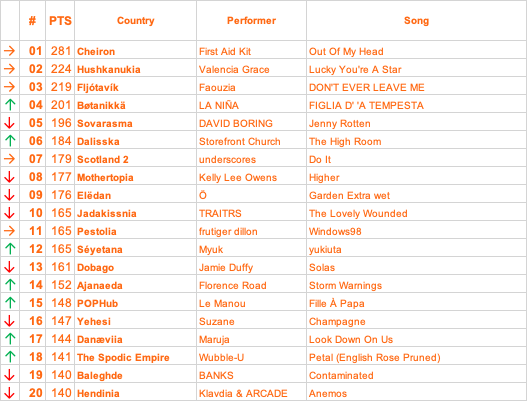 2 hours ago2 hr Author COR LUPUS 49/63On 03/02/2026 at 09:45, Cody Rozanov said:Hi everybody, we are Santos Bravos!DREW: Thanks so much to everyone who have been supporting us for the past couple months! We wouldn’t have gotten this far without you 🩵ALEJANDRO: You guys have voted hard and it’s time to see who did the best.Our 18 points go to... a big win for the F1 fans, Faouzia and Fljótavík!18 POINTS | Faouzia – DON'T EVER LEAVE ME [Fljótavík]15 POINTS | Le Manou – Fille À Papa [POPHub]13 POINTS | Klavdia & ARCADE – Anemos [Hendinia] 12 POINTS | KAS:ST – Sound Of The Soul [Kluminican Republic]11 POINTS | KING BOOO! – Tunes Since '89 [Aeroche]10 POINTS | frutiger dillon - Windows98 [Pestolia]09 POINTS | Valencia Grace – Lucky You're A Star [Hushkanukia]08 POINTS | underscores - do it [Scotland 2]07 POINTS | Ancient Umbra - Iron Will [Jupiterdonia]06 POINTS | Kelly Lee Owens - Higher [Mothertopia]05 POINTS | Suzane - Champagne [Yehesi]04 POINTS | LustSickPuppy - RIDE IT [Trifoski]03 POINTS | Kai Tracid - 4 Just 1 Day [Ben’s Sanctuary]02 POINTS | Denis Dekay – Don't Leave [Summericia]01 POINTS | umiña - spiral [Cumulonimbia](Commiserations to: Baleghde (16th), Cheiron (17th), Juranabaijan (18th), Neliönoir (19th) and Herbilore (20th) 😭)KAUÊ: Congrats to all the countries for an amazing contest!GABI: Don’t forget to stream our new single “KAWASAKI” available now.KENNETH: Muchas gracias! Thanks so much for having us!JUPITERDONIA 50/63On 03/02/2026 at 12:52, J00prstar said:a solid set with a couple of new discoveries i enjoyed! very much enjoying my local folk inspired music this yrI think this might be First Aid Kit's contest to lose tho+18 FLORENCE ROAD // ajanaeda+15 KLAVDIA // hendinia+13 FIRST AID KIT // cheiron+12 MERINA GIRLS // deandria+11 HOT CHIP // zanmantony+10 LUSTSICKPUPPY // trifoski+09 ZETAK // greenfroze+08 MI.A // taahino+07 FAOUZIA // fljotavik+06 KELLY LEE OWNES // mothertopia+05 KING BOO // aeroche+04 CSAKNEKEDKISLANY // land of dw+03 JAMIE DUFFY // dobago+02 KAI TRACID // bens sanctuary+01 STOREFRONT CHURCH // dalisskaHope you enjoyed Jupiterdonia's foray into instrum trance, we will be genre-shifting again in the next contest!With another +13 to Cheiron, Jupiterdonia may be on the money tonight, although the closest competition in Hushkanukia and Fljótavík continue to get sizeable points...