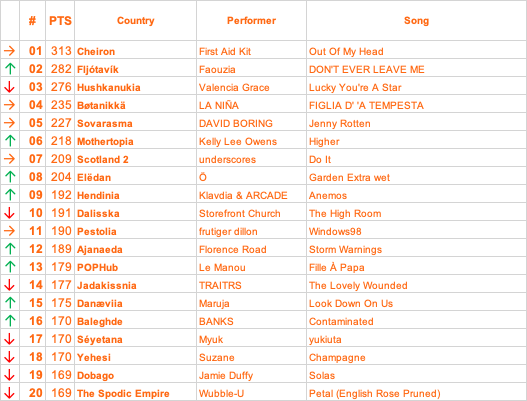 4 hours ago4 hr Author THELONIA 25/63On 31/01/2026 at 19:15, lewistgreen said:18 points: Octo Octa – Spin Girl, Let's Activate! (Skall)15 points: LustSickPuppy – RIDE IT (Trifoski)13 points: frutiger dillon - Windows98 (Pestolia)12 points: KING BOOO! - Tunes Since '89 (Aeroche)11 points: Kelly Lee Owens - Higher (Mothertopia)10 points: Hot Chip - Devotion (Zanmatony)9 points: Kai Tracid - 4 Just 1 Day (Ben's Sanctuary)8 points: yeule - Veil Of Darkness (Terra Avium)7 points: Le Manou – Fille À Papa (POPHub)6 points: Ancient Umbra - Iron Will (Jupiterdonia)5 points: underscores - Do It (Scotland 2)4 points: TRAITRS - The Lovely Wounded (Jadakissnia)3 points: Denis Dekay – Don't Leave (Summericia)2 points: umiña – spiral (Cumulonimbia)1 point: Wubble-U - Petal (English Rose Pruned) (The Spodic Empire)AEROCHE 26/63On 31/01/2026 at 19:25, ✖ leww ✖ said:✖ leww ✖" data-ipsquote-contentapp="core" data-ipsquote-contenttype="messaging" data-ipsquote-contentclass="core_Messenger_Conversation" data-ipsquote-contentid="132835" data-ipsquote-contentcommentid="138774" class="ipsQuote" data-gramm="false" cite="" data-ipsquote="">18 Cheiron :: First Aid Kit – Out Of My Head15 Mothertopia :: Kelly Lee Owens – Higher13 Cumulonimbia :: umiña – spiral12 Kluminican Republic :: KAS:ST – Sound Of The Soul11 Danæviia :: Maruja – Look Down On Us10 Skall :: Octo Octa – Spin Girl, Let's Activate!09 Yehesi :: Suzane – Champagne08 Scotland 2 :: underscores – Do It07 Herbilore :: Mia Wray – Only Love06 The Spodic Empire :: Wubble-U – Petal (English Rose Pruned)05 Neliönoir :: FAUST – Dies Irae04 Hushkanukia :: Valencia Grace – Lucky You're A Star03 Fljótavík :: Faouzia – DON'T EVER LEAVE ME02 Land of DW :: Csaknekedkislány – Minden Mozog01 Lotunia :: Army Of Lovers – Love Is Blue (feat. Olya Polyakova)Commiserations (in running order):1 Sovarasma :: DAVID BORING – Jenny Rotten3 Zephyra Continuum :: Electrotête – I Love You (Cubic 22 Remix)4 Ben's Sanctuary :: Kai Tracid – 4 Just 1 Day8 Ajanaeda :: Florence Road – Storm Warnings10 Deandria :: Merina Gris – Mejor*16 Jadakissnia :: TRAITRS – The Lovely Wounded20 Jupiterdonia :: Ancient Umbra – Iron Will26 Elëdan :: Ö – Garden Extra wet28 Baleghde :: BANKS – Contaminated31 Dalisska :: Storefront Church – The High Room32 Trifoski :: LustSickPuppy – RIDE IT34 Hendinia :: Klavdia & ARCADE – AnemosSome more big points to the host nation from Aeroche!! Is another top 10 for us possible with another half of the votes yet to be revealed?
