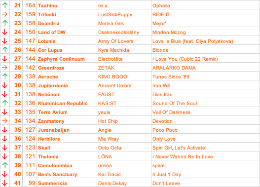 4 hours ago4 hr Yes up into the top 30 - thank you @Chez Wombat and @PeteFromLeeds . A pity that Suzane dropped quite a bit, but happy for First Aid Kid to be #1.