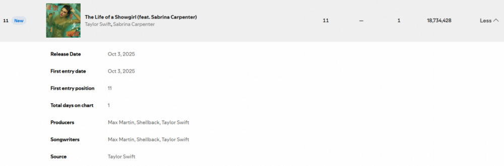 Sabrina has achieved her biggest daily numbers on Spotify with "The Life of a Showgirl". The track achieved 18,734,428 streams on Spotify yesterday. It is also the 18th biggest daily streams for any song on the platform. @javier78 @EmailsICantChase- Swifting Services Chart Discussion; W/C 03/10/25