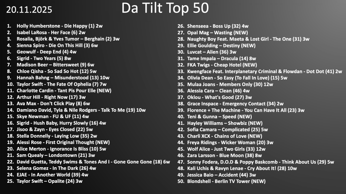This week sees 9 new entries - the highest charting at #11. Hannah Bahng finally hits the top 10 after 10 weeks in the chart. "Talk To Me" climbing again - what a bouncebackability. Battle for #1 was between Rosalia, Isabel LaRosa and Holly Humberstone - each of them deserves the #1, but there can only be one. Here is the official countdown of my Top 50 And here come this week's Top 50 songs 1. Holly Humberstone - Die Happy (1) 2w 2. Isabel LaRosa - Her Face (6) 2w 3. Rosalia, Björk & Yves Tumor – Berghain (2) 3w 4. Sienna Spiro - Die On This Hill (3) 6w 5. Geowulf - Deep End (4) 4w 6. Sigrid - Two Years (5) 8w 7. Madison Beer – Bittersweet (9) 6w 8. Chloe Qisha - So Sad So Hot (12) 5w 9. Hannah Bahng – Misunderstood (13) 10w 10. Taylor Swift - The Fate Of Ophelia (7) 7w 11. Charlotte Cardin - Tant Pis Pour Elle (NEW) 12. Arthur Hill - Right Now (17) 3w 13. Ava Max - Don't Click Play (8) 6w 14. Damiano David, Tyla & Nile Rodgers - Talk To Me (19) 10w 15. Skye Newman - FU & UF (11) 4w 16. Sigrid - Hush Baby, Hurry Slowly (16) 4w 17. Jisoo & Zayn - Eyes Closed (22) 5w 18. Stella Donnelly - Laying Low (35) 2w 19. Alessi Rose - First Original Thought (NEW) 20. Alice Merton - Ignorance Is Bliss (10) 5w 21. Sam Quealy – Londontown (21) 3w 22. David Guetta, Teddy Swims & Tones And I - Gone Gone Gone (18) 6w 23. Selena Gomez - In The Dark (26) 4w 24. EJAE - In Another World (39) 4w 25. Taylor Swift – Opalite (24) 3w 26. Shenseea - Boss Up (32) 4w 27. Opal Mag – Wasting (NEW) 28. Naughty Boy Feat. Maeta & Lost Girl - The One (31) 3w 29. Ellie Goulding – Destiny (NEW) 30. Luvcat – Alien (36) 3w 31. Tame Impala – Dracula (14) 8w 32. FKA Twigs - Cheap Hotel (NEW) 33. Kwengface Feat. Interplanetary Criminal & Flowdan - Dot Dot (41) 2w 34. Olivia Dean - So Easy (To Fall In Love) (15) 5w 35. Mulaa Joans - Members Only (30) 12w 36. Alessia Cara – Clean (46) 4w 37. Oklou - What's Good (27) 3w 38. Grace Inspace - Emergency Contact (34) 2w 39. Florence + The Machine - You Can Have It All (23) 3w 40. Teni & Gunna – Speed (NEW) 41. Hayley Williams – Showbiz (NEW) 42. Sofia Camara – Complicated (25) 5w 43. Charli XCX - Chains of Love (NEW) 44. Freya Ridings - Wicker Woman (20) 3w 45. Wolf Alice - Just Two Girls (33) 12w 46. Zara Larsson - Blue Moon (38) 8w 47. Sonny Fodera, D.O.D & Poppy Baskcomb - Think About Us (29) 5w 48. Kali Uchis & Ravyn Lenae - Cry About It! (28) 10w 49. Jessica Baio – Accident (44) 3w 50. Blondshell - Berlin TV Tower (NEW)