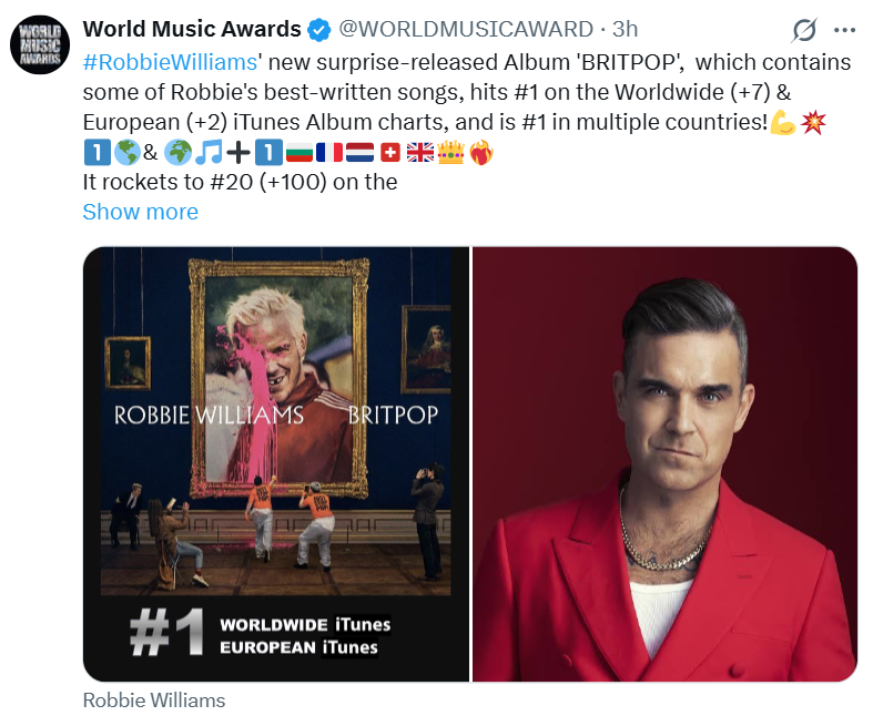 Robbie Williams – "Britpop": Breaking news! When the world was still in order!Status:01/19/2026, 03:46 PM By: Max Dax Robbie Williams. © Jason Hetherington The new album "Britpop" by Robbie Williams seems like a journey through time. What do Robbie allow? Announced in advance for months, postponed several times, most recently to February, finally released last Friday without further comments: The new, the darn 13th album, the not really necessary new, not really eagerly awaited new album by Robbie Williams, which seems unnecessarily dated due to the fact that the title, "Britpop", and the cover as well as some tracks had already been known for months. Cover of the new album by Brian Williams. © Sony Music A word about cover and title: These are the names and looks like records that some design offices design in such a way that they (hopefully) cut edge surf the zeitgeist. In the cinema, one would speak of blockbuster posters, which is a learned sign language under which it does not work. Robbie Williams then comes up with a motif that shows two "Just Stop Pop!" activists smearing a portrait of Robbie (with a gap in his teeth) in a tracksuit, which hangs next to old hams in a dignified, public picture gallery, with pink paint (and documenting this process in portrait format for TikTok with their smartphones). When Robbie Williams released his first solo album "Life Through a Lens" in 1997, almost 30 years ago, this decision manifested the break with the boy band Take That, with which he had become famous. It was an attempt to free oneself from a golden cage and to emancipate oneself from an expectation that had already inscribed its expiration date. He went all-in, cut the ties to the cow, which could have been milked for years to come, and hoped for an equally golden future. It could also have gone wrong. But the calculation worked. Today, his hits, especially "Angels", are played before, between and after finals at the World Cup and the Champions League. In mainstream pop, this is the greatest accolade an entertainer can earn, the end of the ladder, the place where the air gets thin. Correcting the pastAfter the initial success, Robbie Williams lurched for three decades. Although his commercial success remained largely true to him, many of his albums released since then have seemed like second or third infusions of his first smash hits. Swing albums with a big band, Christmas albums and the obligatory recordings with symphony orchestra didn't make it any better – his career began to resemble that of Eros Ramazzotti, who has been chasing his own successes for decades. So now "Britpop" or the attempt to remind us in the wake of the beer- and nostalgia-filled Oasis reunion that there was once an unsympathetic, yet extremely successful pop trend in the 1990s, which even when it was new at the time, seemed unpleasantly nationalistic, backward-looking and conformist. In fact, Williams' debut at the time was an extremely successful attempt to establish himself as a solo artist in the wake of this wave. "Britpop" consists of eleven songs and has a running time of 38 minutes. This is the classic length of a vinyl album, when vinyl albums were still the measure of all things, and hints at what Robbie Williams may have been up to here: With between 75 and 100 million records sold behind him, without time pressure and without a real agenda, to briefly correct the past. So this includes, in a way in a journey through time, to return to the sound of that time and compose a series of songs that could also come from the carefree, hedonistic 1990s in terms of arrangement. The sensation of hearing "Britpop" can be compared to the experience of taking the dusty CD version of a Britpop album from the 1990s out of a moving box, stripping off the dust and playing the record loudly – just like back when the world was still in order. In fact, Robbie Williams collects more good songs on "Britpop" than on the last dozen albums before, even if it doesn't contain any uber-hits like "Angels" or "Let Me Entertain You". So he shows what he can do, but he also shows (involuntarily?) what he may no longer be able to retrieve – like a former world footballer who can then perform all the tricks and step-overs again in Canada or Saudi Arabia in the autumn of his career because he is no longer really attacked. Consequently, the whole undertaking has a bizarre, sometimes out-of-the-box lightness, which brings many convincing and quite surprising songs with it due to the quality of the songwriting and production. One example is the wall of sound of the opening song "Rocket", which Williams wrote together with Tony Iommi, the former Black Sabbath guitarist. The power ballad "All My Life" sounds like Oasis with Robbie Williams as singer, but with self-deprecating lyrics that are rather missing from Oasis: "My life is based on a true story, one of love, chaos and audacity". Finally, for the sake of all good things, just three songs as an example, "Morrissey", a synthipop ballad about Morrissey, the forerunner of Britpop when Britpop was still called The Smiths, and whose career recently imploded into controversy, mainstream and nationalism. Robbie Williams actually wrote this song together with Gary Barlow, his comrade-in-arms from the time of Take That, and goes down like butter. When listening to "Britpop" repeatedly, however, the suspicion increasingly arises that chance after chance to write real pop songs for eternity has been missed. This feeling that makes music "as if" here, with the handbrake slightly on, which sometimes gets in the way of one's own cleverness (or that of his spin doctors), and which is nevertheless one of the best things he has ever achieved – this is the culmination of a feeling that one seems to have always had with Robbie Williams: This darned, this great art, which seems to be within reach right behind the mainstream, simply can't get a grasp. Robbie Williams surfs the Oasis nostalgia 